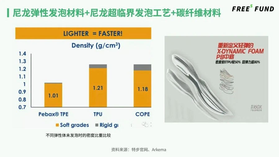 一個答案是,新的功能性材料帶來更好的運動表現(xiàn)。特步結(jié)合碳板材料,以跑鞋中底的新材料作為突破口,推出超低密度、低重量、更具有回彈力的運動鞋。中底指的是鞋墊和大底中間的那一層發(fā)泡材料,起到保護、緩沖、穩(wěn)定的作用。